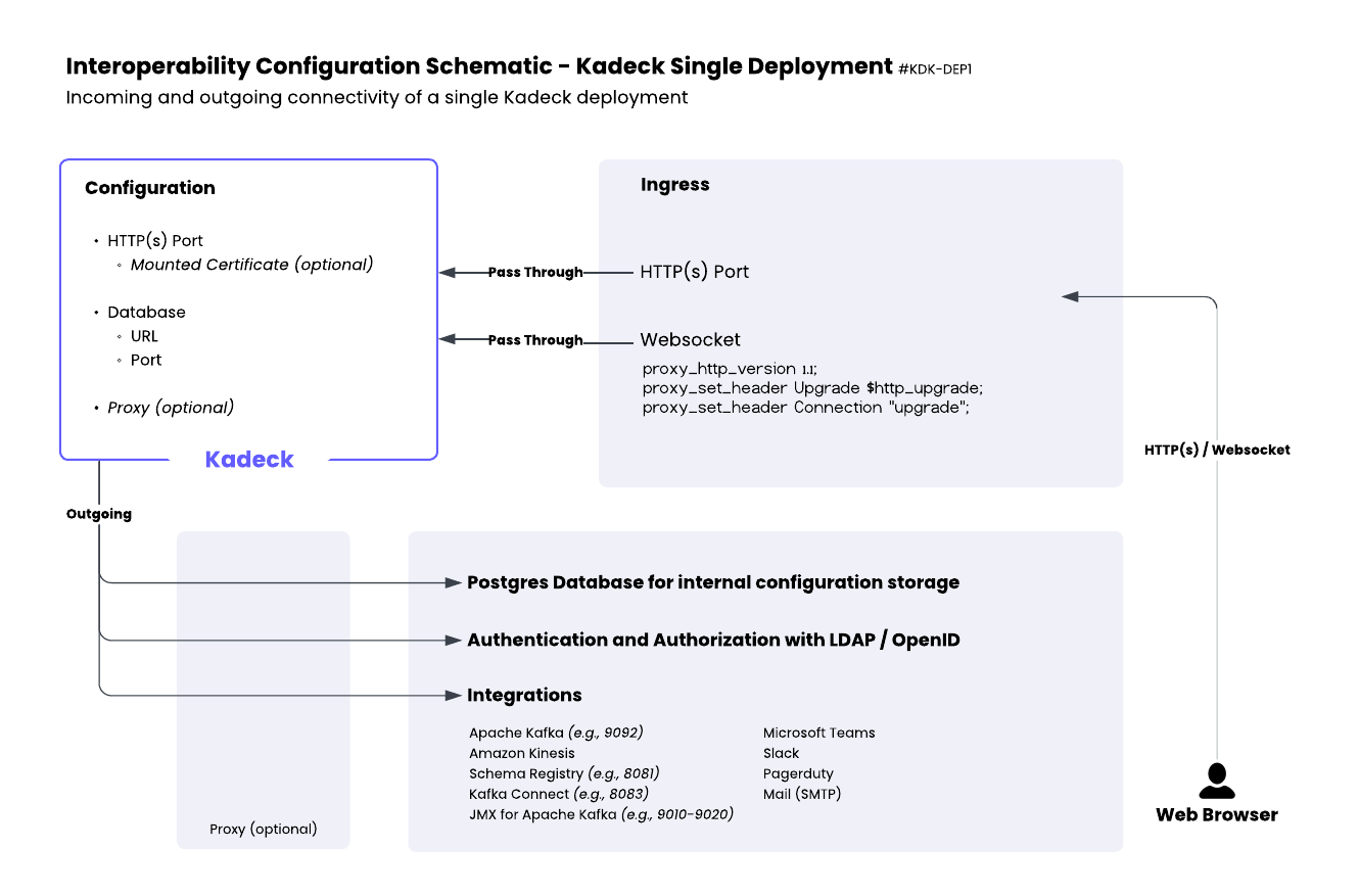 A comprehensive network strategy is essential before deploying Kadeck. This chapter outlines the interoperability considerations, network requirements, and connectivity patterns necessary for a successful single deployment of Kadeck.