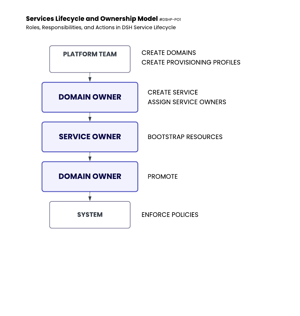 - Domain Owners promote services to higher environments (e.g., Dev → QA → Prod).